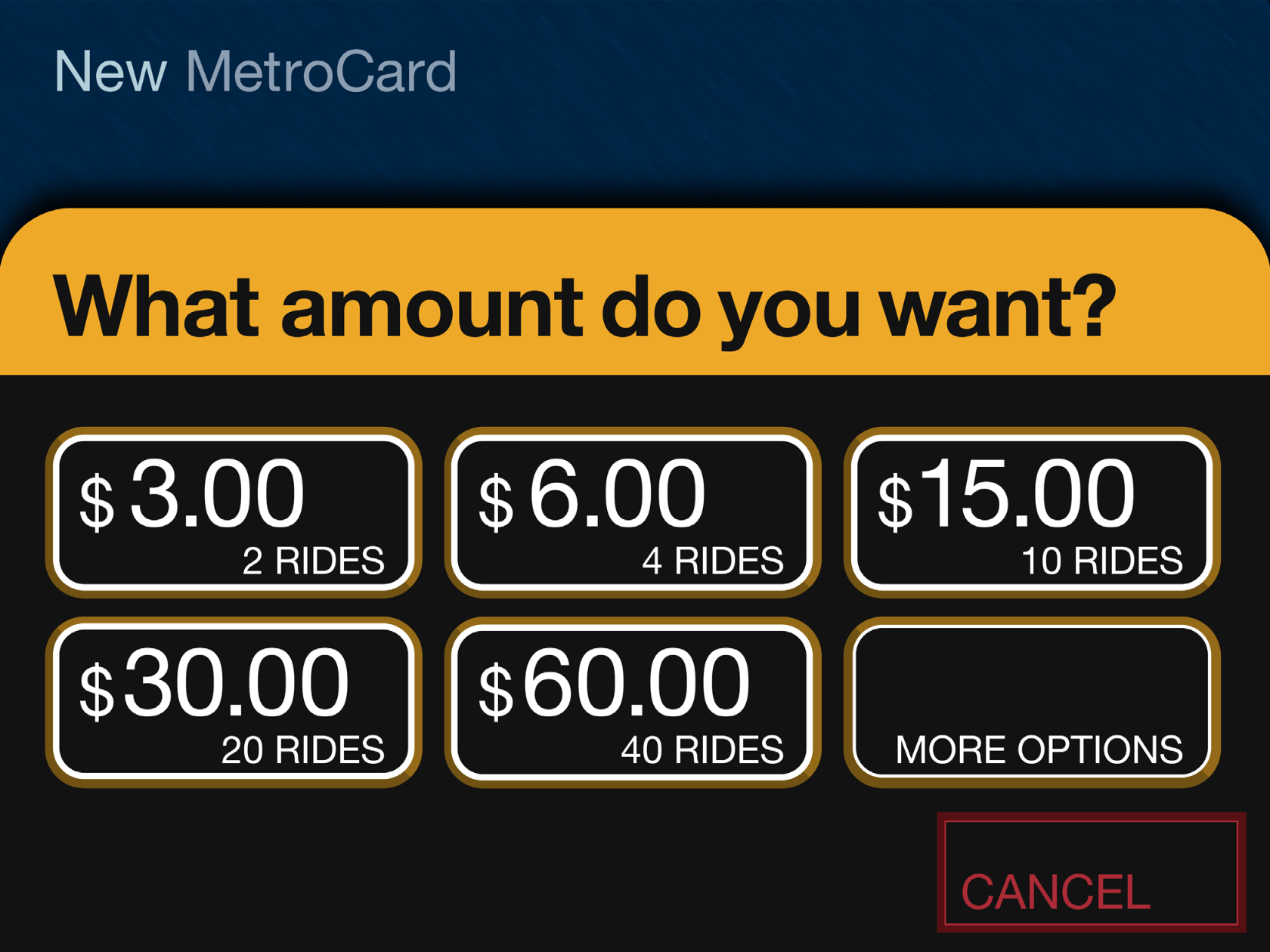 At the time, the MTA (Metropolitan Transit Authority) was moving away from tokens and would soon introduce the MetroCard, a magnetic swipe stored value system, for fare payment. The MetroCard uses card readers built into turnstiles to validate transactions. Although you could also buy your MetroCard from the token booth, the MTA would soon offer an electronic vending machine for purchasing a MetroCard via a touchscreen interface. The new machine would eventually make the token booth redundant. There’d still be a clerk there to manage questions and problems and hand out maps, but most of the cards were meant to be sold through the machine. The MTA had been working on this project for a while already, but the machine was delayed. The job was commissioned to Cubic Westinghouse, a defense and public transportation contractor based in San Diego who was already building turnstiles and station furniture for the MTA. You might imagine that Cubic Westinghouse didn’t have a great deal of experience, or design nuance anyway, for the electronic, user-facing aspects of this new machine which facilitates a rather complicated transaction.