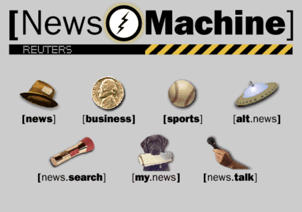 I remember Netscape 0.9b well. I was working for Two Twelve Associates in New York (see Sylvia Harris from last class) as a young, rather green junior designer. Two Twelve had worked on a series of early screen-based projects when Reuters approached with a new project. Founded in 1851 and based in London, Reuters was one of the world’s largest news providers. By 1994, Reuters was ready to reach a new audience through a consumer-facing website they called the Reuters News Machine. Being eager, and technically-minded, I convinced the studio that I could do this project. I found a contract programmer, Stuart Constantine of the early design blog CORE77, to produce a small, static website to deliver real-time news stories. Here is what the homepage looked like, all 150k of it: