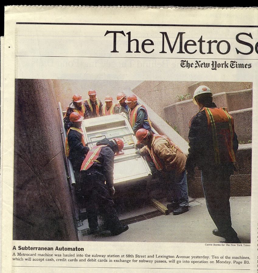 The first Metrocard Vending Machines were installed in New York City subway stations in January, 1999. Here’s one being shoehorned into 68th Street station, Manhattan:
